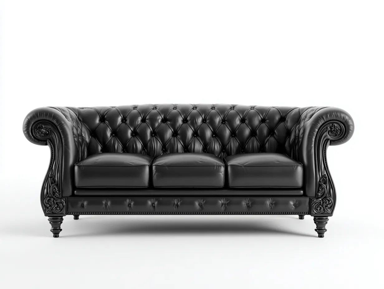 Le revêtement est en cuir de couleur noire avec une finition lisse et capitonnée sur le dossier et les accoudoirs. La structure est stable et soigneusement travaillée, avec des détails décoratifs visibles qui renforcent l'aspect raffiné du canapé.
