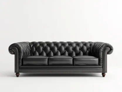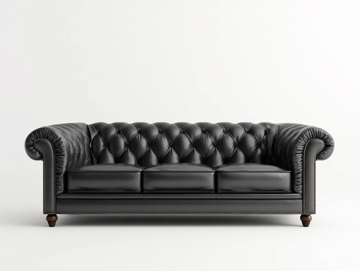 Le revêtement est réalisé en cuir de couleur noire, avec un capitonnage profond sur le dossier et les accoudoirs. Les finitions sont soignées, avec des coutures régulières et des clous décoratifs discrets soulignant le style classique du canapé.