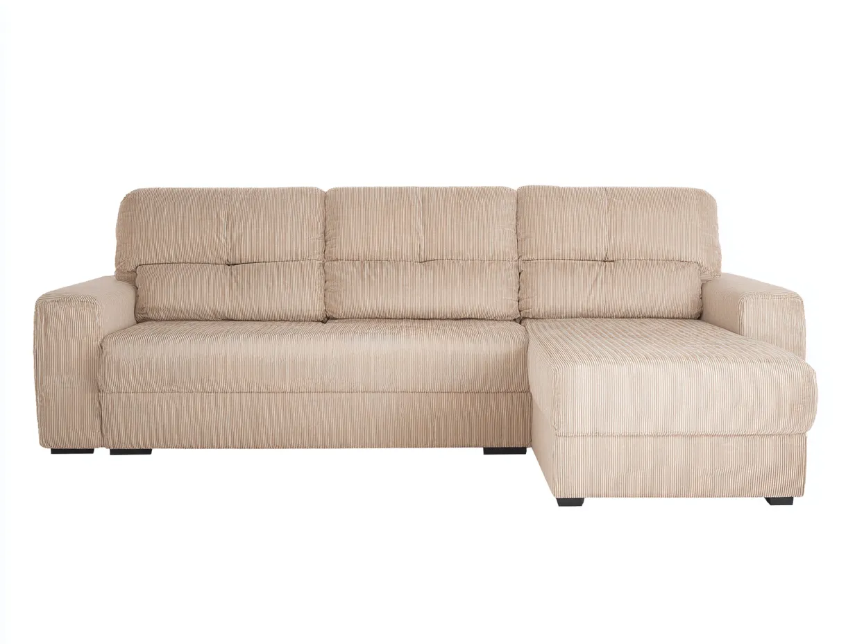 Le canapé est habillé d'un tissu côtelé de couleur beige, agréable au toucher et visuellement chaleureux. La structure robuste assure une bonne stabilité et un usage fiable au quotidien.